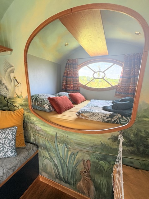 L’intérieur, entièrement peint de paysages exotiques peuplé d’oiseaux imaginaires vous emmènera vers des contrées lointaines…